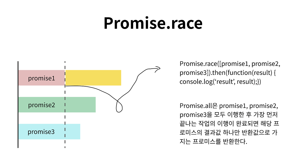 Promise.race는 Promise.all과 동일하게 파라미터로 Iterable 객체(순회 가능한 객체)를 받는다. 따라서 Promise.race의 구문은 Promise.all과 동일하다. 다만 차이는 이행 결과에 있다. Promise.race는 파라미터로 받은 프로미스들 중 가장 먼저 완료되는 프로미스 한 개의 이행 또는 거부의 결과값만을 반환한다.