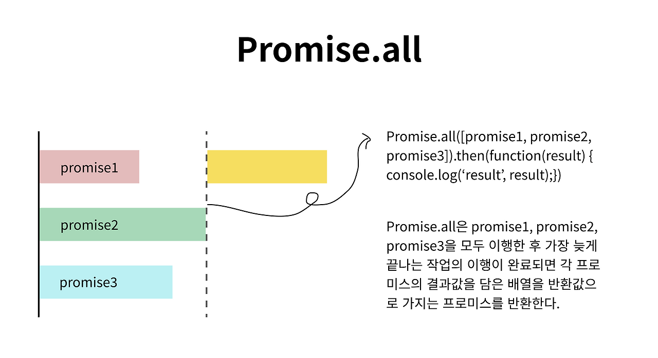 Promise.all은 파라미터로 주어진 Iterable 객체(보통은 배열의 형태가 많음)의 모든 프로미스를 이행한 후 새로운 프로미스를 반환한다. 이 때 반환되는 프로미스는 파라미터로 받은 배열 안의 프로미스의 결과값을 담은 새로운 배열을 result로 가지게 된다. 새로운 프로미스의 result 배열의 요소 순서는 Promise 이행 완료의 순서와는 상관 없이 Promise.all의 파라미터 배열의 요소 순서와 상응한다.
