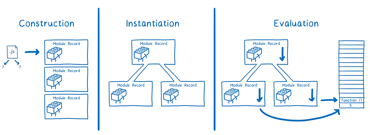 자바스크립트 엔진은 먼저 모듈 환경 레코드를 생성한 후 이를 통해 모듈 레코드의 변수를 관리한다. 생성된 모듈 환경 레코드는 각 export와 연관되어 있는 메모리 공간을 추적하는데, 이 때 자바스크립트 엔진은 다른 것에 의존하지 않는 그래프의 최하단까지 조사한 후 export를 설정하고 모든 export를 연결한다.