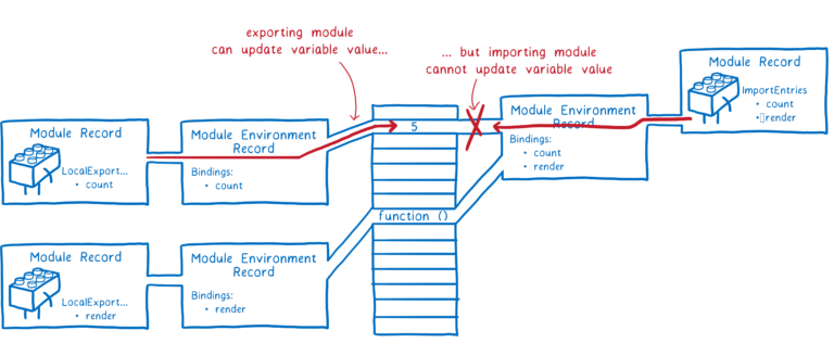 한 모듈에 대한 export와 import는 같은 메모리 주소를 가르키게 되는데, 이를 라이브 바인딩이라고 한다. 이는 import들이 각각의 export에 연결되어 있다는 것을 보장한다. 이렇게 함으로써 해당 모듈을 import하는 모듈에서는 export하는 모듈에서 발생하는 변경사항을 알 수 있게 된다. 하지만 import하는 모듈에서는 가져온 값을 변경할 수는 없다. (단, 모듈이 객체를 가져오는 경우에는 해당 객체에 있는 프로퍼티의 값을 변경할 수는 있다.)
