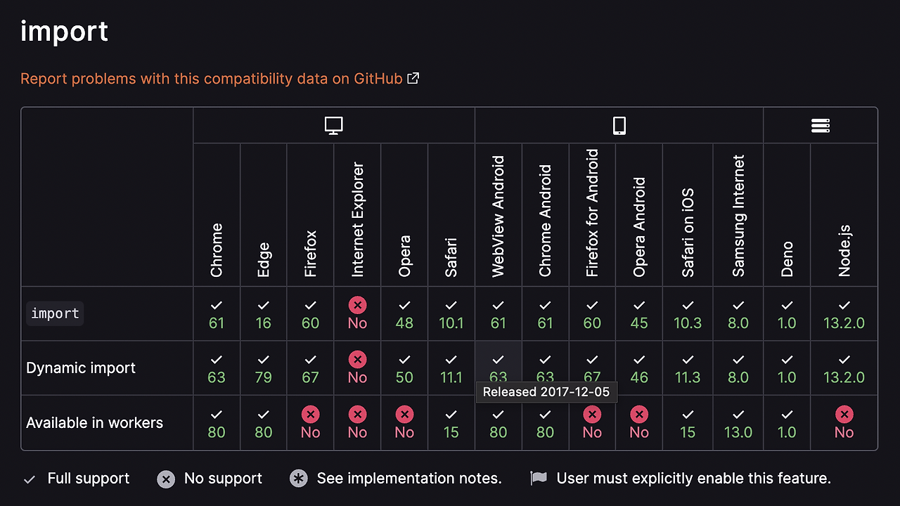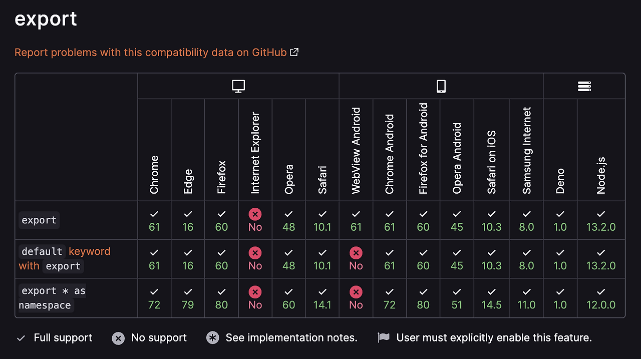 기존에는 위와 같은 라이브러리에 의존해야 했던 모듈 기능을 ECMAScript 6부터 네이티브 자바스크립트에서도 지원하기 시작했으며 여러 브라우저에서도 모듈 로딩을 최적화할 수 있도록 모듈 기능을 지원하고 있다. 브라우저별 export와 import문의 호환성은 아래와 같다. (IE에서는 무슨 일이 일어나고 있는 걸까..?)